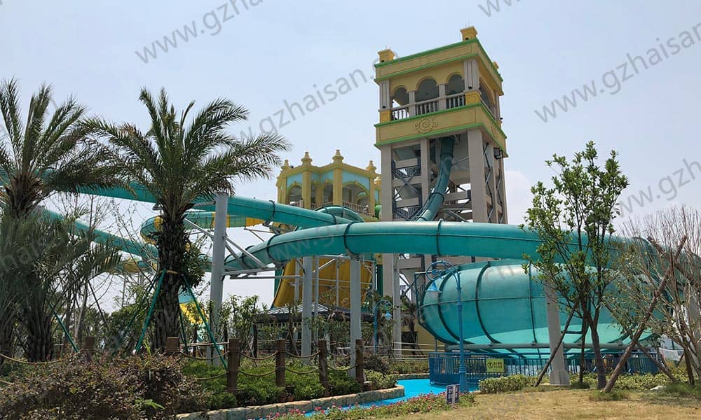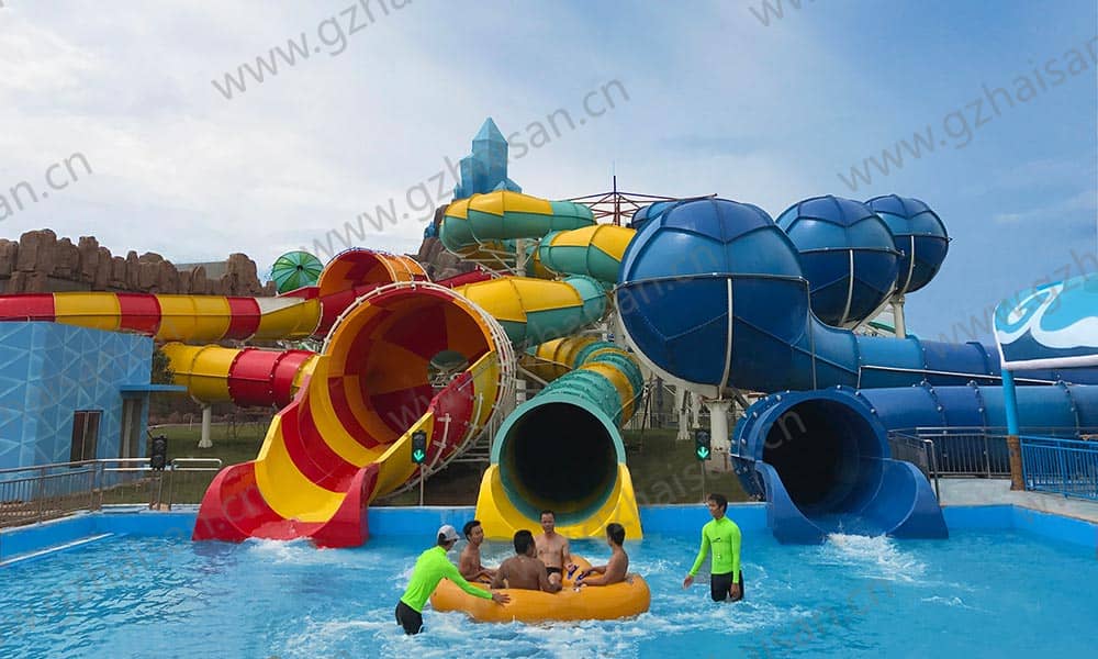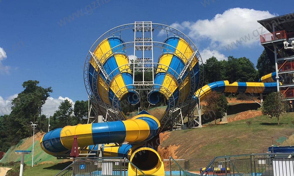 章魚滑梯是一種由封閉螺旋和波浪競(jìng)賽滑梯組成的特殊滑梯,它可以為三道以上。游客可以一人一道從封閉螺旋引道處同時(shí)滑下,繞過黑暗的一圈后,光明接著來臨,迎接游客的是波浪競(jìng)賽滑梯,經(jīng)過上上下下的滑行后最終落入落水池。